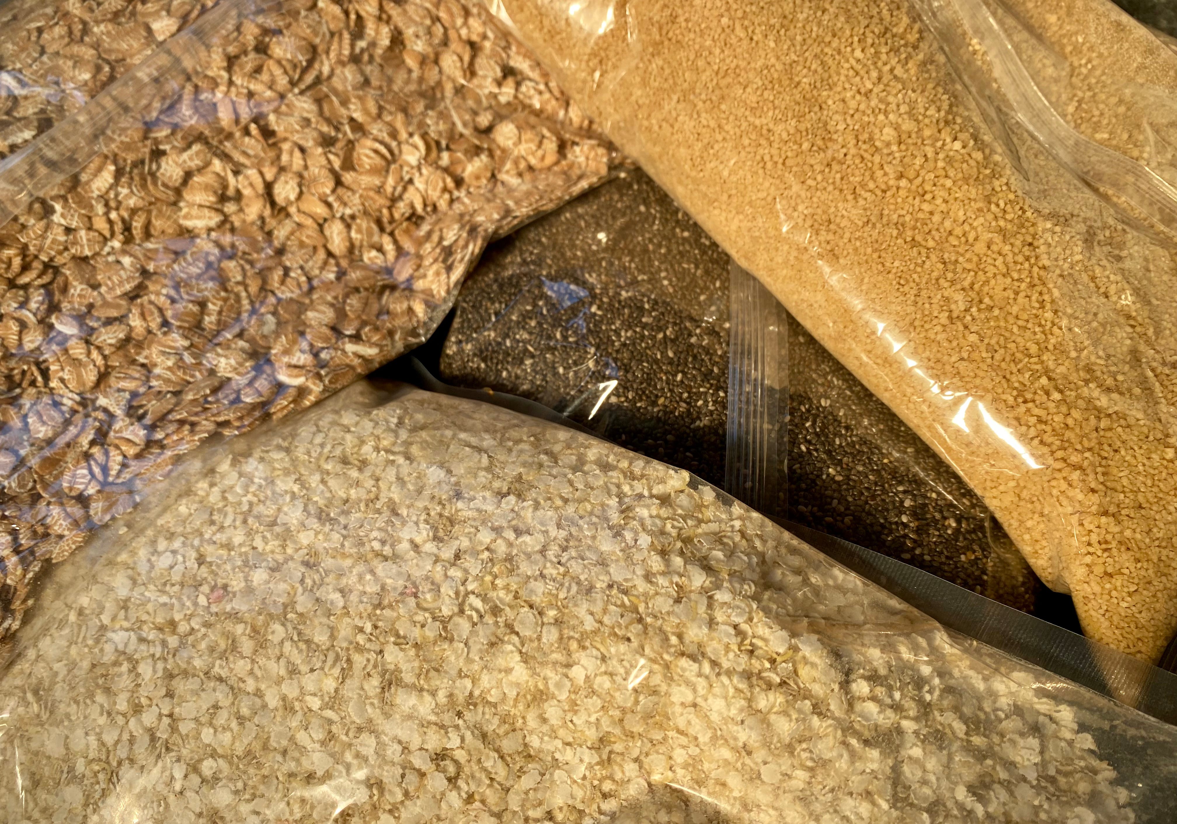 It wasn’t cheap but buying bulk is certainly cheaper than supermarket prices. Spelt and quinoa flakes, chia seeds, wholemeal couscous and brazil nuts.