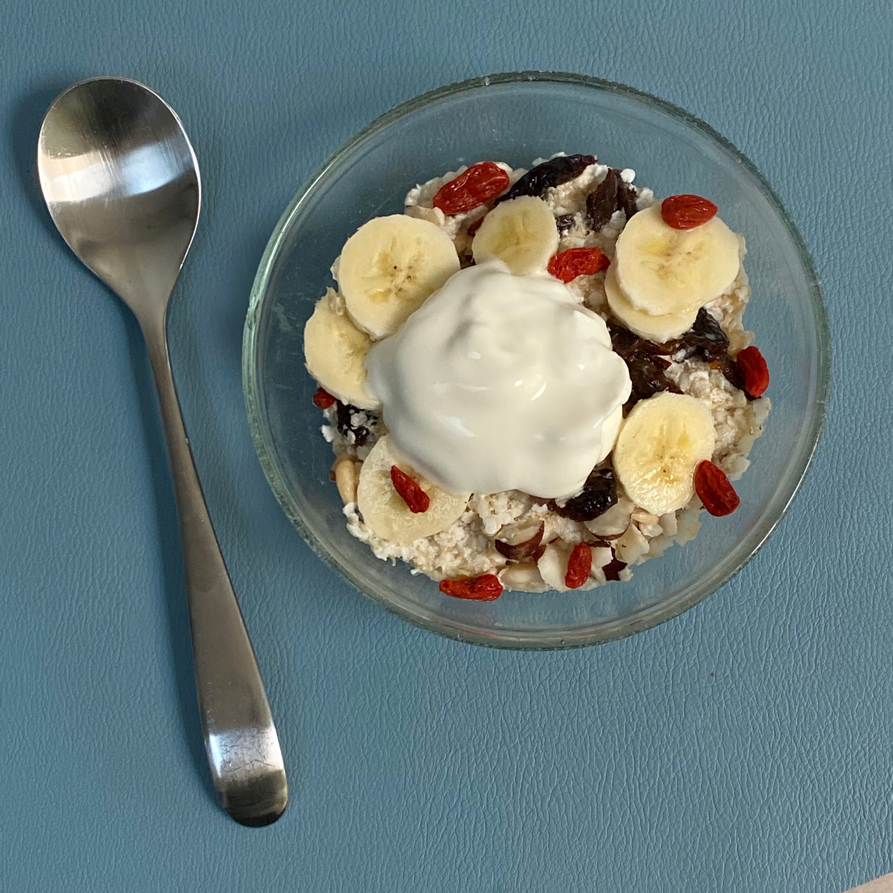 As the kids have been having a lie in most days I soaked the spelt and quinoa flakes with goji berries in oat milk and added chopped brazil nuts, chopped dried figs, pine nuts and a drizzle of honey topped with some chopped banana and homemade yogurt.