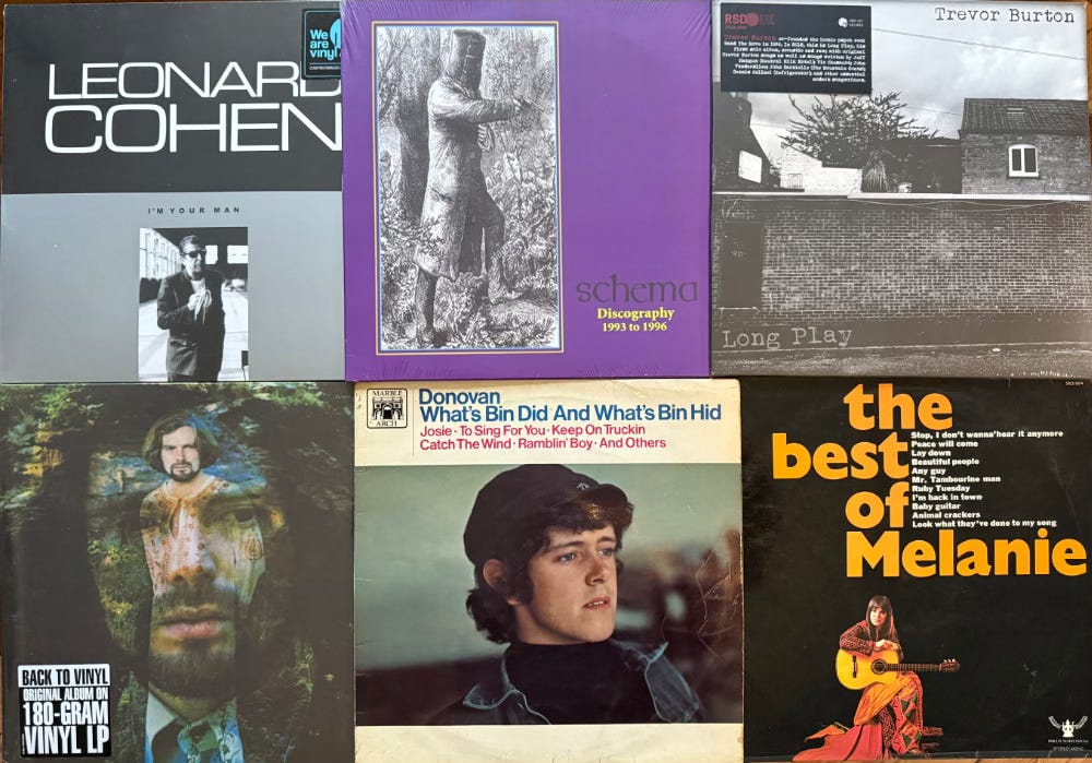 Recent vinyl acquisitions have been Leonard Cohen - I’m your man, A rare album by unsigned band Schema, Trevor Burton’s - Long Play, Van Morrison - His band and the street choir, Donovan - What’s bin did and what’s bin hid and The best of Melanie.