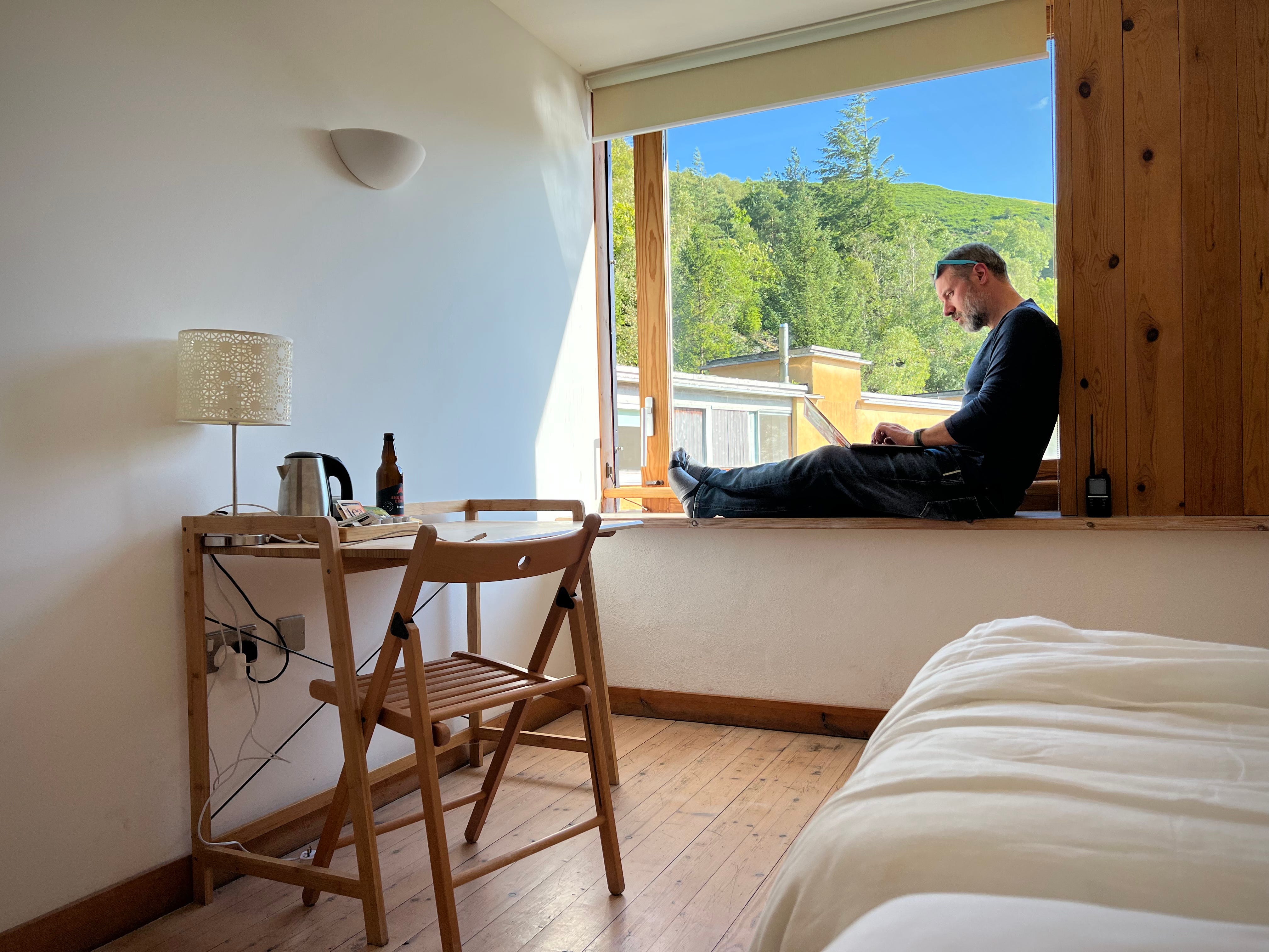 And what a lovely place it is. I was looking in the area for accommodation as my lad has spent a week in the eco cabins here. Off grid. Device free and powered by sun, wind and water. After failing elsewhere, I thought to call here. Glad I did. They have accommodation for the courses they run and I bagged B&B for £60. I have beer, snacks and the mountains.