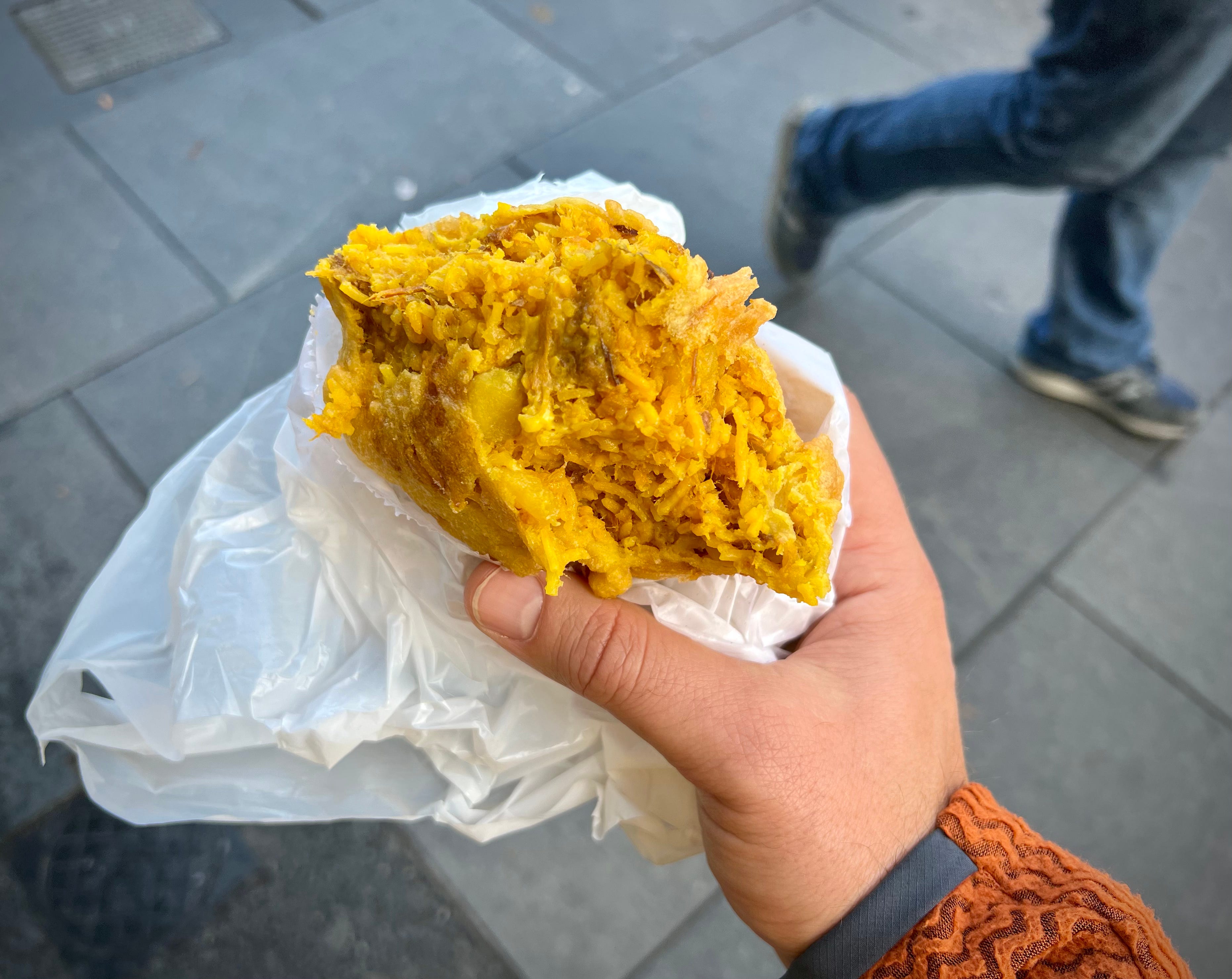 I have no idea what it’s called. But it cost £3 from a Colombian fast food place in Brixton. It was mostly rice, onions, possible meat and maybe potato. It was certainly deep fried and mildly spiced. This incredible food stuff was the only thing that stood between me and a bad case of alcohol poisoning. If I can learn to make it I may have found something to rival the portability of a sandwich and belly filling abilities of a scotch egg. Know what it is? Please let me know in the comments.
