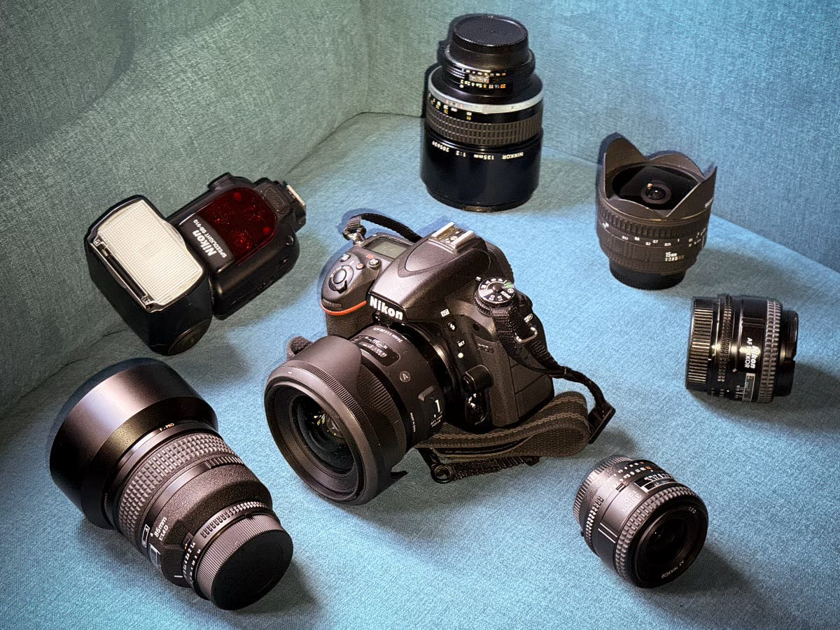 My camera bag has the Nikon D750, a Speedlight SB910, a Nikon 85 mm 1.4, a manual Nikon 135 F2 lens, a Nikon 35mm F2, A Nikon 50mm F1 .4, A Sigma 24 mm F1 .4 and a, Sigma 15 mm 2.8 fisheye lens.