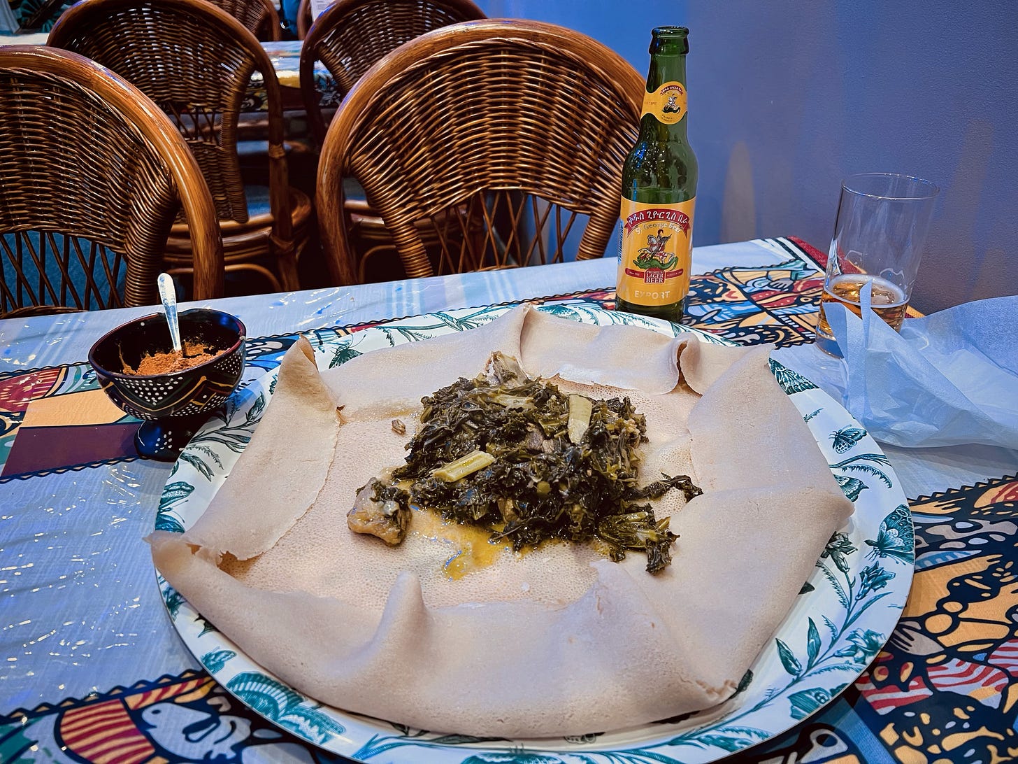 It was served on an Injera a traditional Ethiopian pancake, with a slightly sour taste. I think I ate something similar in Sudan once. No cutlery. You rip a piece of the pancake off and use it to pick up the food. Delicious and very satisfying.