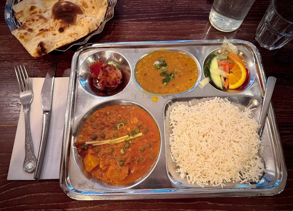 Thali simply means ‘plate’ in Hindi. But over time it now describes a meal served in a selection of small dishes arranged on a single metal plate. Sometimes in bowls, sometimes a trey like above.