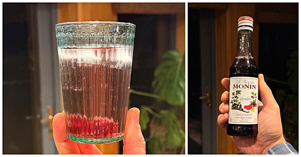 It’s bloody delicious. Dangerously so. The key ingredient is Grenadine. A syrup which is now made with corn syrup or sugar mixed with water, citric acid and flavourings (the bottle above has raspberry, black berry and elderberry). Originally it was made by reducing pomegranate juice with sugar and it’s now a small life goal of mine to try to make this with proper true-to-its-origins Pomegranate Grenadine. You can grow pomegranates in polytunnels but it might take 3 to 5 years… So I ordered some online.
