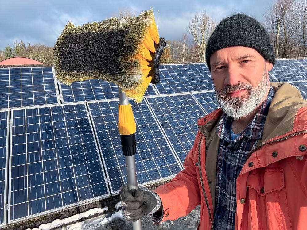 I’m not always on a roof. But after our first snowfall since moving here, I felt the need to clear the snow from the solar panels.